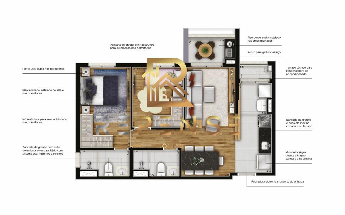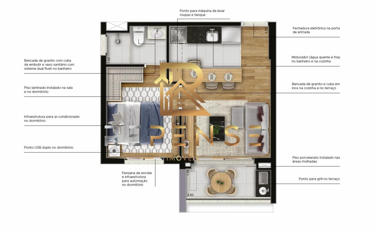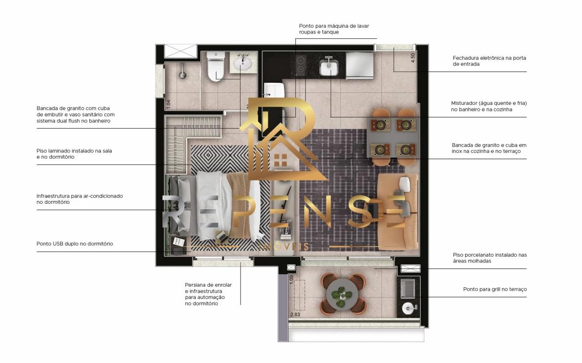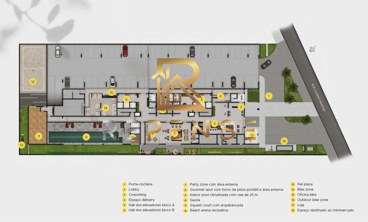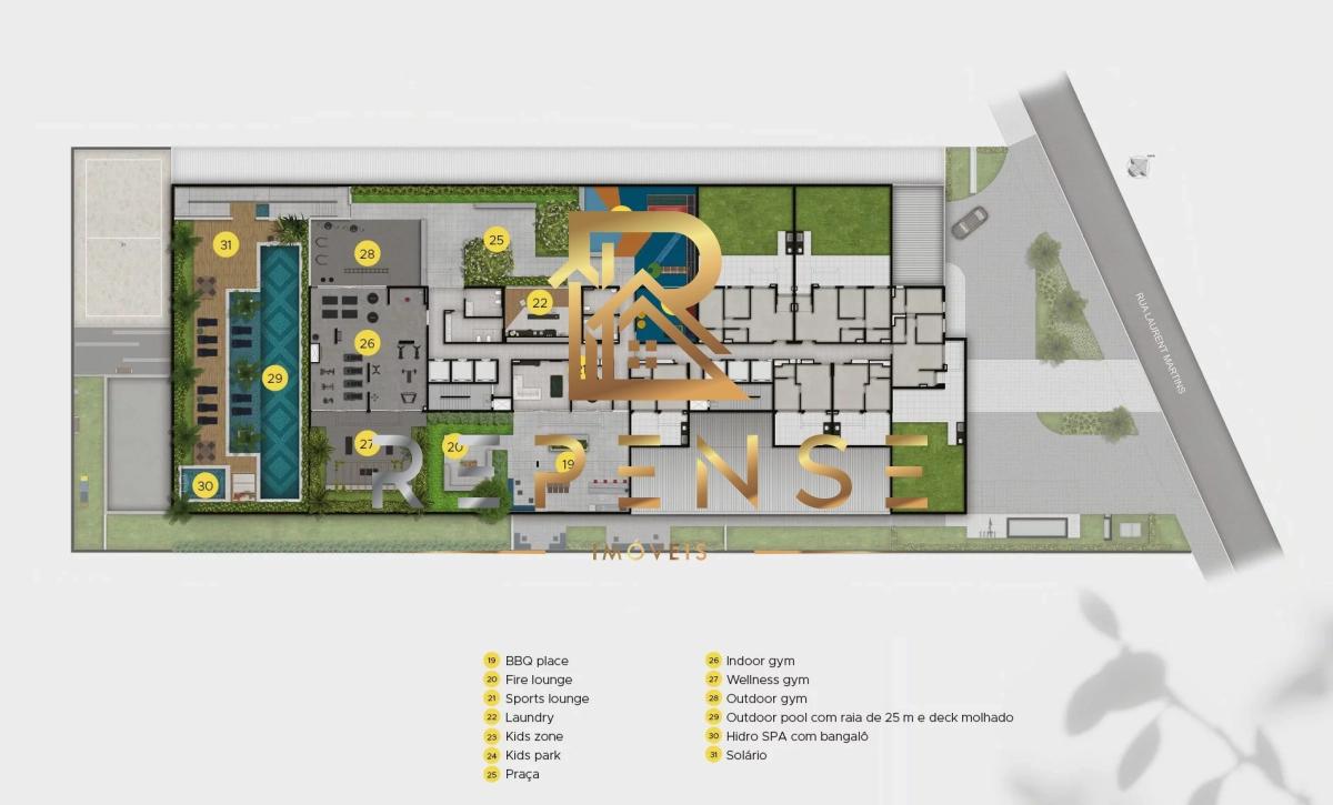 A área de lazer será um Club Vip com 32 itens, serviço de concierge, todas as vagas cobertas e 30 vagas para visitantes, também cobertas.